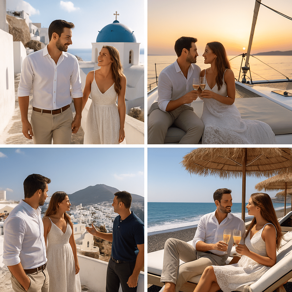 A 3-day private honeymoon experience in Santorini with luxury transfers, catamaran cruise, island tour, beach club access, and dining reservations.