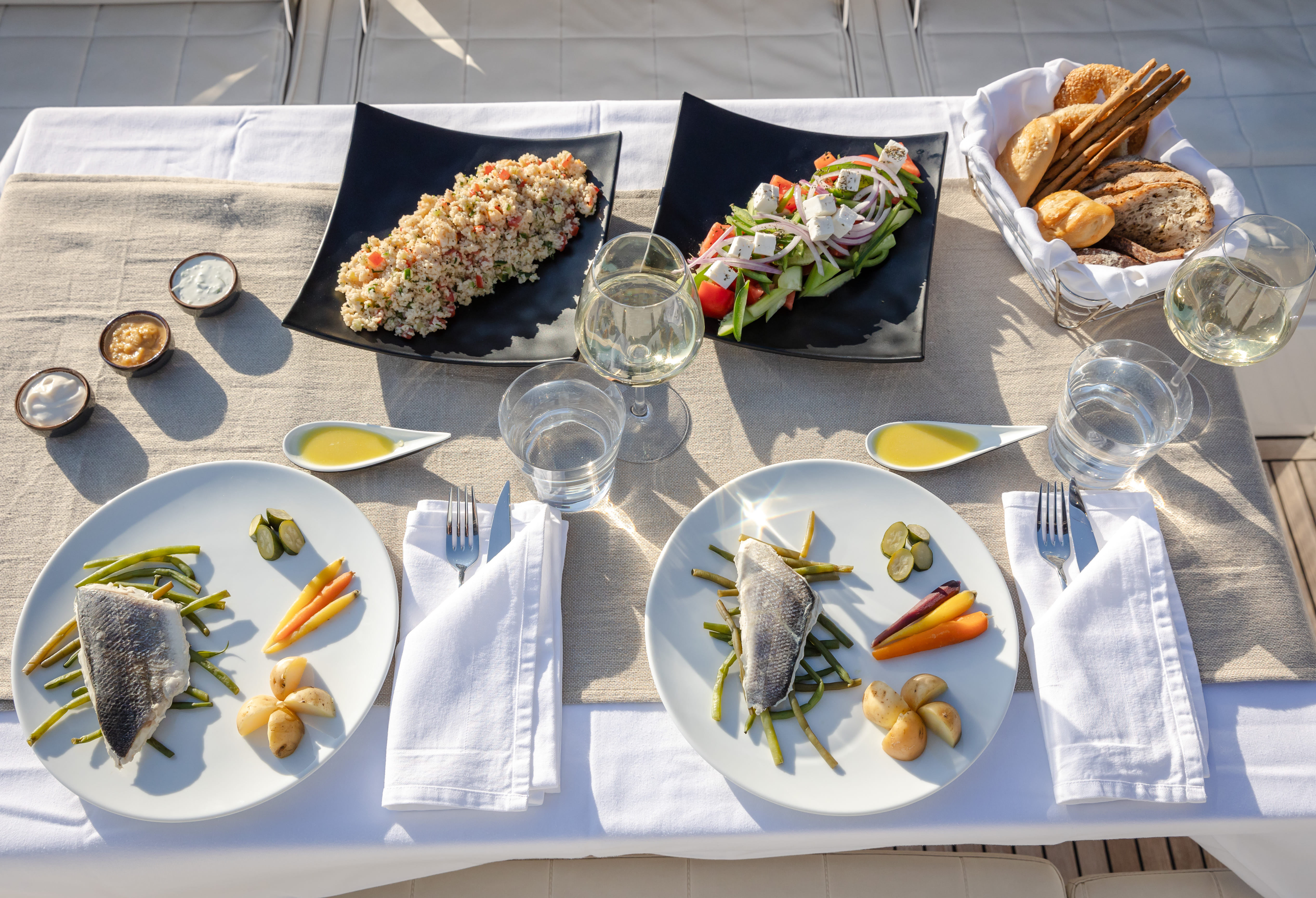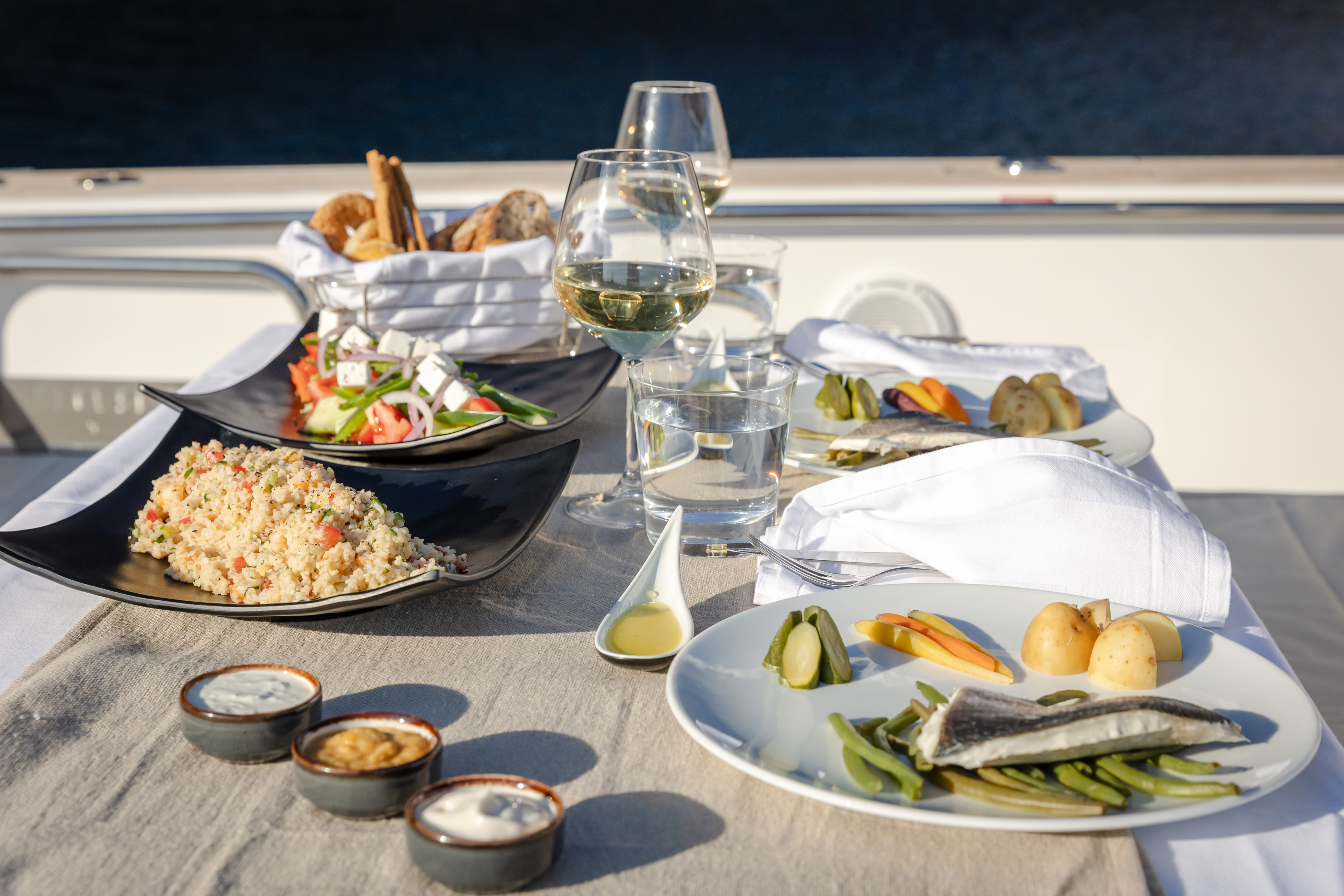 Continue along the southern coast, passing the dramatic shores of Red Beach, White Beach, and the Akrotiri lighthouse. As the sun begins to lower, your crew will serve a freshly prepared Greek dinner on board, featuring grilled meats, pasta, fresh salad, tzatziki, and unlimited drinks — all enjoyed with spectacular views.